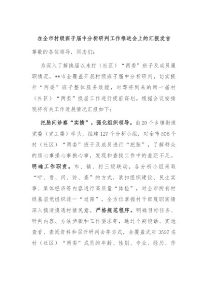 / 【七哥公文】2024年:在全市村级班子届中分析研判工作推进会上的汇报发言+更多免费公文+VX:QiGeGongWen2024