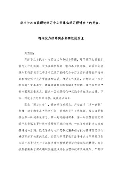 【七哥公文】2024年:秘书长在市委理论学习中心组集体学习研讨会上的发言:精准发力抓落实务实高效提质量+更多免费公文+VX:QiGeGongWen2024