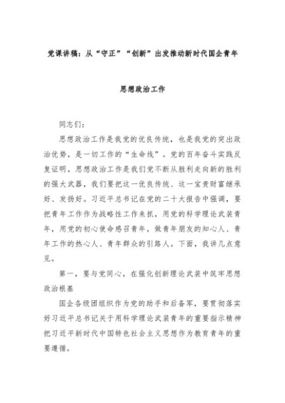 【七哥公文】2024年:党课讲稿:从“守正”“创新”出发推动新时代国企青年思想政治工作+更多免费公文+VX:QiGeGongWen2024