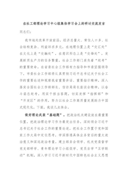 / 【七哥公文】2024年:在社工部理论学习中心组集体学习会上的研讨交流发言+更多免费公文+VX:QiGeGongWen2024