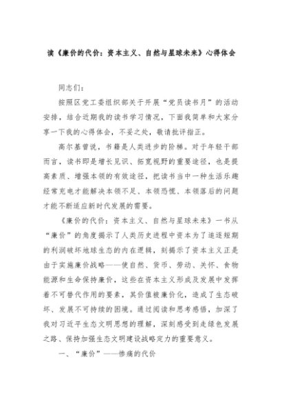 / 【七哥公文】2024年:读《廉价的代价:资本主义、自然与星球未来》心得体会+更多免费公文+VX:QiGeGongWen2024