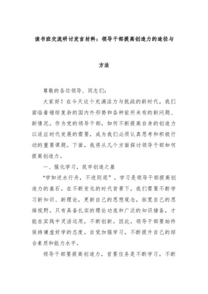 【七哥公文】2024年:读书班交流研讨发言材料:领导干部提高创造力的途径与方法+更多免费公文+VX:QiGeGongWen2024