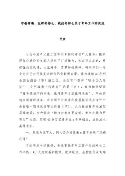 【七哥公文】2024年:市委常委、组织部部长、统战部部长关于青年工作的交流发言+更多免费公文+VX:QiGeGongWen2024