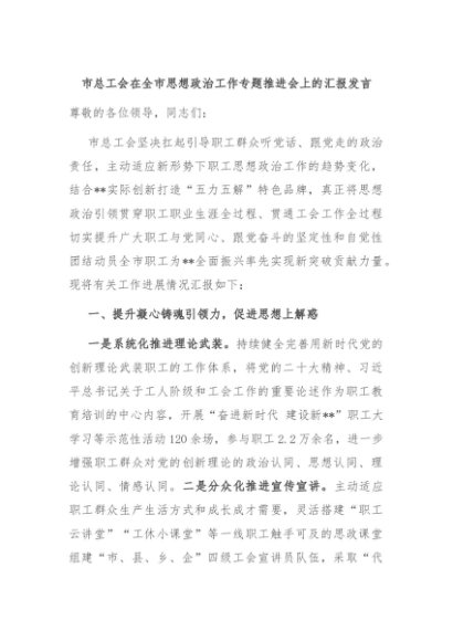 / 【七哥公文】2024年:市总工会在全市思想政治工作专题推进会上的汇报发言+更多免费公文+VX:QiGeGongWen2024