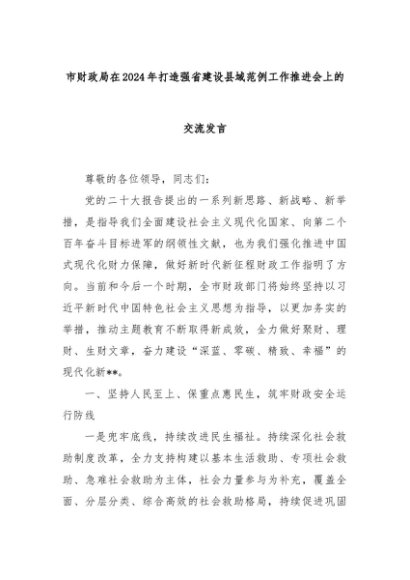 【七哥公文】2024年:市财政局在2024年打造强省建设县域范例工作推进会上的交流发言+更多免费公文+VX:QiGeGongWen2024