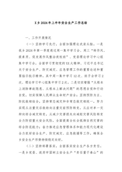 / 【七哥公文】2024年:X乡2024年上半年安全生产工作总结+更多免费公文+VX:QiGeGongWen2024