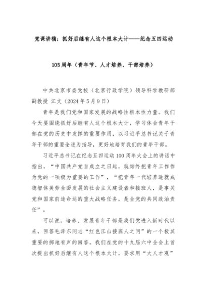 【七哥公文】2024年:党课讲稿:抓好后继有人这个根本大计——纪念五四运动105周年(青年节、人才培养、干部培养)+更多免费公文+VX:QiGeGongWen2024
