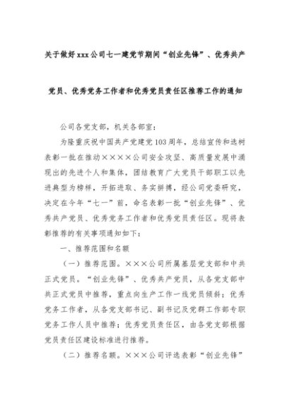【七哥公文】2024年:关于做好xxx公司七一建党节期间“创业先锋”、优秀共产党员、优秀党务工作者和优秀党员责任区推荐工作的通知 (1)+更多免费公文+VX:QiGeGongWen2024