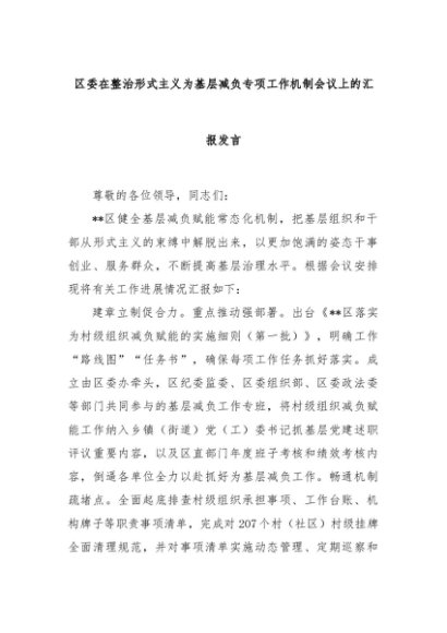 【七哥公文】2024年:区委在整治形式主义为基层减负专项工作机制会议上的汇报发言+更多免费公文+VX:QiGeGongWen2024