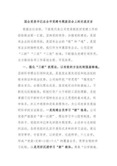 / 【七哥公文】2024年:国企党委书记在全市党建专题座谈会上的交流发言+更多免费公文+VX:QiGeGongWen2024