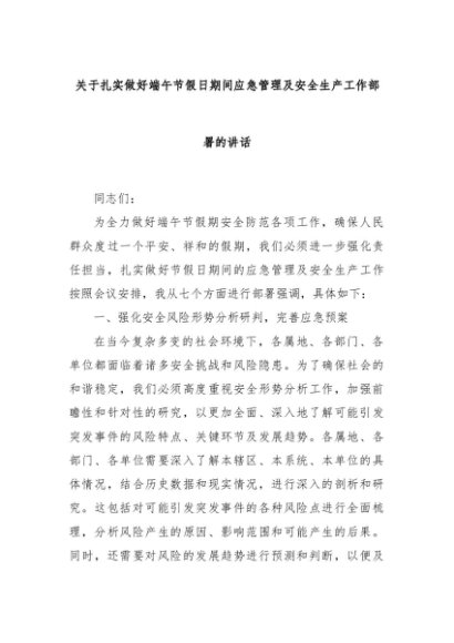 【七哥公文】2024年:关于扎实做好端午节假日期间应急管理及安全生产工作部署的讲话+更多免费公文+VX:QiGeGongWen2024