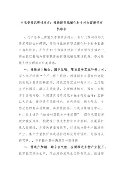 【七哥公文】2024年:乡党委书记研讨发言:推进新型城镇化和乡村全面振兴有机结合+更多免费公文+VX:QiGeGongWen2024