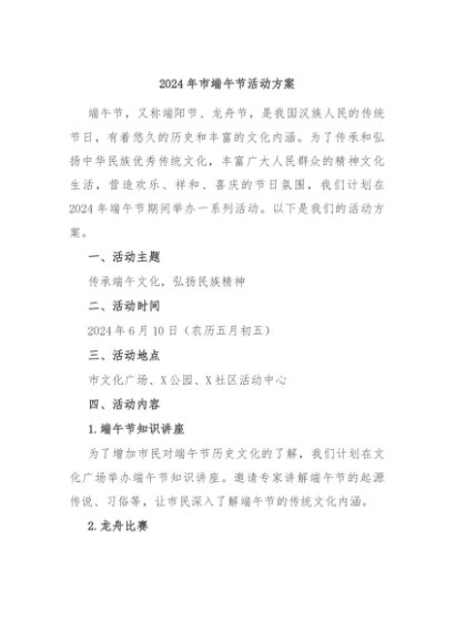【七哥公文】2024年:2024年市端午节活动方案+更多免费公文+VX:QiGeGongWen2024