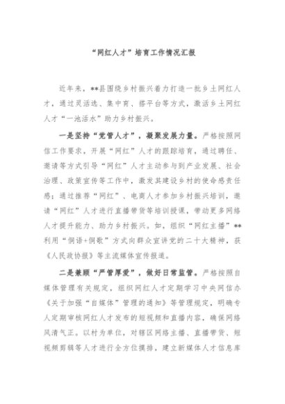 / 【七哥公文】2024年:“网红人才”培育工作情况汇报+更多免费公文+VX:QiGeGongWen2024