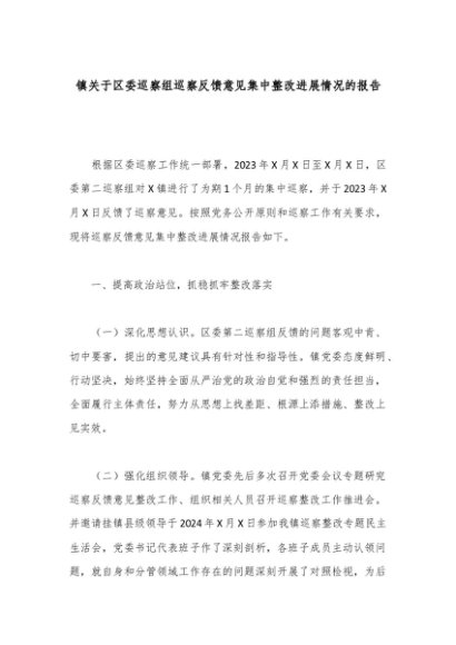 【七哥公文】2024年:镇关于区委巡察组巡察反馈意见集中整改进展情况的报告+更多免费公文+VX:QiGeGongWen2024