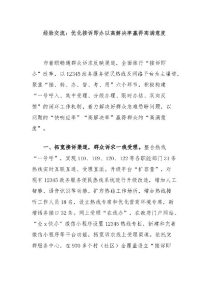 【七哥公文】2024年:经验交流:优化接诉即办以高解决率赢得高满意度 (1)+更多免费公文+VX:QiGeGongWen2024