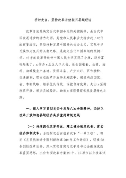 【七哥公文】2024年:研讨发言:坚持改革开放振兴县域经济+更多免费公文+VX:QiGeGongWen2024