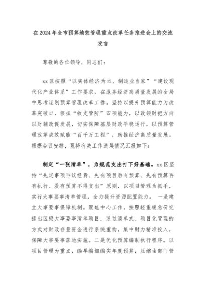 【七哥公文】2024年:在2024年全市预算绩效管理重点改革任务推进会上的交流发言+更多免费公文+VX:QiGeGongWen2024