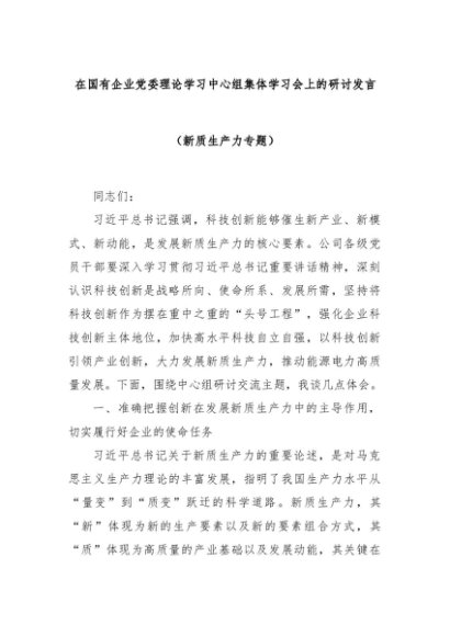 【七哥公文】2024年:在国有企业党委理论学习中心组集体学习会上的研讨发言(新质生产力专题)+更多免费公文+VX:QiGeGongWen2024