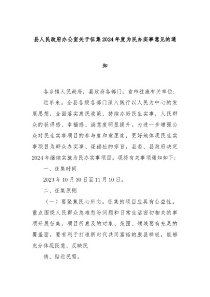 【七哥公文】2024年:县人民政府办公室关于征集2024年度为民办实事意见的通知+更多免费公文+VX:QiGeGongWen2024