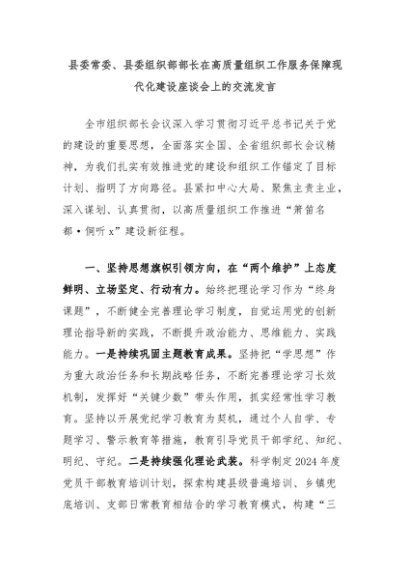 【七哥公文】2024年:县委常委、县委组织部部长在高质量组织工作服务保障现代化建设座谈会上的交流发言+更多免费公文+VX:QiGeGongWen2024