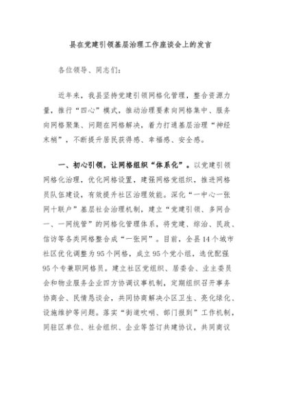 / 【七哥公文】2024年:县在党建引领基层治理工作座谈会上的发言+更多免费公文+VX:QiGeGongWen2024