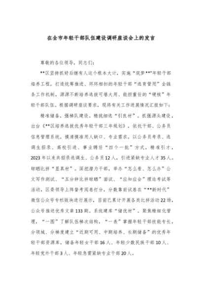 / 【七哥公文】2024年:在全市年轻干部队伍建设调研座谈会上的发言+更多免费公文+VX:QiGeGongWen2024