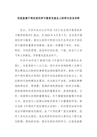 / 【七哥公文】2024年:纪检监察干部在党纪学习教育交流会上的研讨发言材料+更多免费公文+VX:QiGeGongWen2024