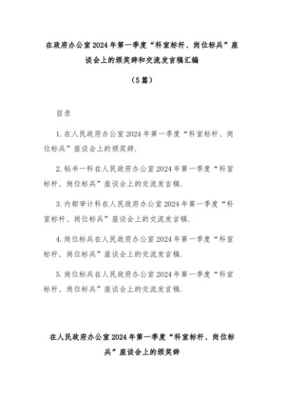 【七哥公文】2024年:(5篇)在政府办公室2024年第一季度“科室标杆、岗位标兵”座谈会上的颁奖辞和交流发言稿汇编+更多免费公文+VX:QiGeGongWen2024