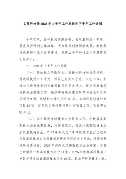 【七哥公文】2024年:X县科技局2024年上半年工作总结和下半年工作计划+更多免费公文+VX:QiGeGongWen2024