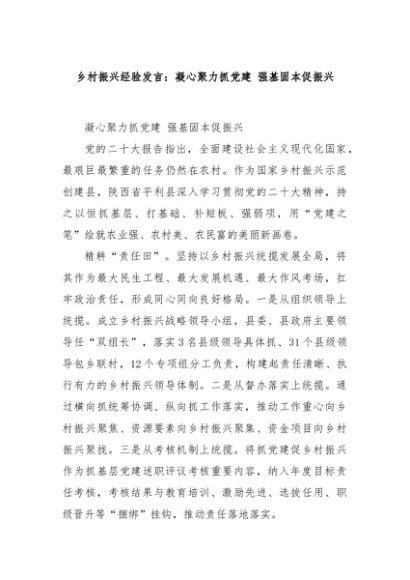 / 【七哥公文】2024年:乡村振兴经验发言:凝心聚力抓党建 强基固本促振兴+更多免费公文+VX:QiGeGongWen2024