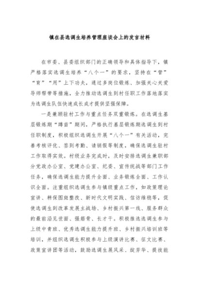/ 【七哥公文】2024年:镇在县选调生培养管理座谈会上的发言材料+更多免费公文+VX:QiGeGongWen2024