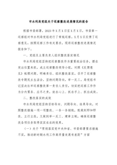 / 【七哥公文】2024年:市水利局党组关于巡察整改进展情况的报告+更多免费公文+VX:QiGeGongWen2024