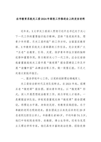【七哥公文】2024年:在市教育系统关工委2024年高校工作推进会上的发言材料+更多免费公文+VX:QiGeGongWen2024