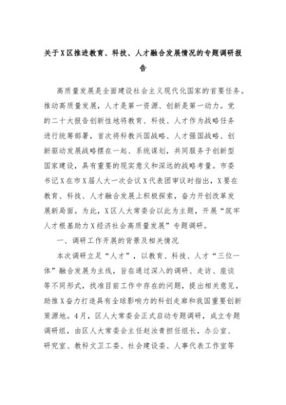 【七哥公文】2024年:关于X区推进教育、科技、人才融合发展情况的专题调研报告+更多免费公文+VX:QiGeGongWen2024