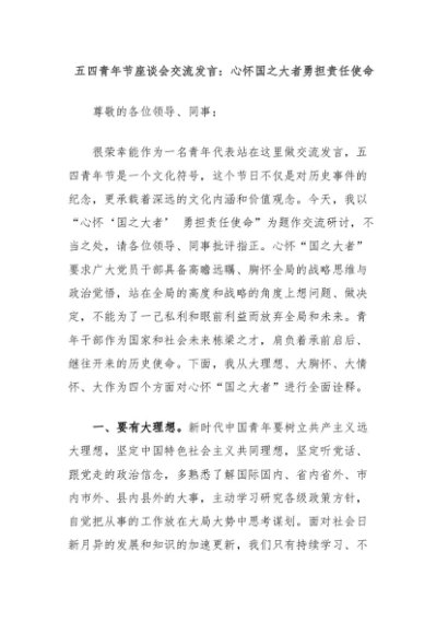 【七哥公文】2024年:五四青年节座谈会交流发言:心怀国之大者勇担责任使命+更多免费公文+VX:QiGeGongWen2024