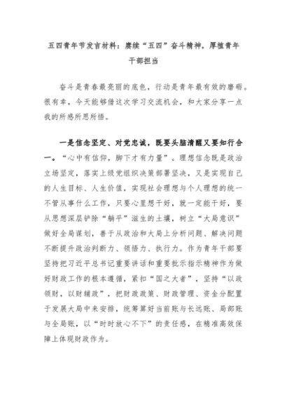 【七哥公文】2024年:五四青年节发言材料:赓续“五四”奋斗精神,厚植青年干部担当+更多免费公文+VX:QiGeGongWen2024