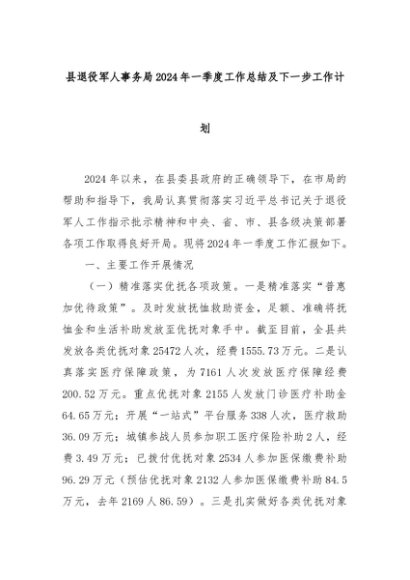 【七哥公文】2024年:县退役军人事务局2024年一季度工作总结及下一步工作计划+更多免费公文+VX:QiGeGongWen2024