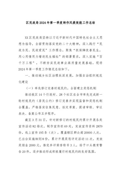 / 【七哥公文】2024年:区民政局2024年第一季度转作风提效能工作总结+更多免费公文+VX:QiGeGongWen2024
