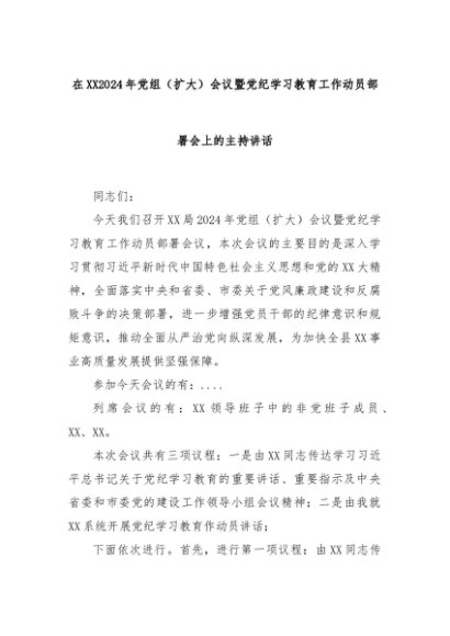 【七哥公文】2024年:在XX2024年党组(扩大)会议暨党纪学习教育工作动员部署会上的主持讲话+更多免费公文+VX:QiGeGongWen2024
