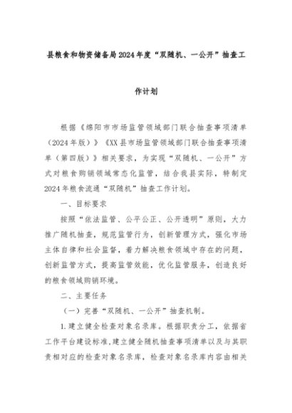 【七哥公文】2024年:县粮食和物资储备局2024年度“双随机、一公开”抽查工作计划+更多免费公文+VX:QiGeGongWen2024