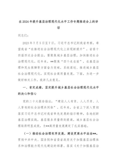 【七哥公文】2024年:在2024年提升基层治理现代化水平工作专题推进会上的讲话+更多免费公文+VX:QiGeGongWen2024