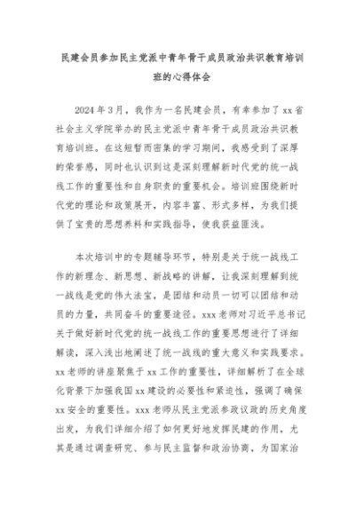 【七哥公文】2024年:民建会员参加民主党派中青年骨干成员政治共识教育培训班的心得体会+更多免费公文+VX:QiGeGongWen2024