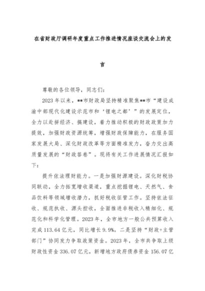 【七哥公文】2024年:在省财政厅调研年度重点工作推进情况座谈交流会上的发言+更多免费公文+VX:QiGeGongWen2024