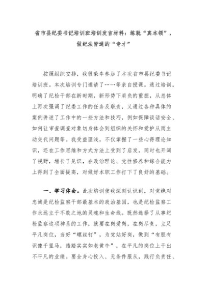 【七哥公文】2024年:省市县纪委书记培训班培训发言材料:练就“真本领”,做纪法皆通的“专才”+更多免费公文+VX:QiGeGongWen2024
