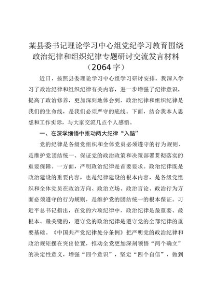 【七哥公文】2024年:某县委书记理论学习中心组党纪学习教育围绕政治纪律和组织纪律专题研讨交流发言材料2064字+更多免费公文+VX:QiGeGongWen2024
