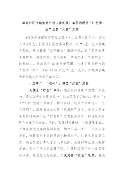 【七哥公文】2024年:城市社区书记党建引领工作汇报:基层治理用“红色物业”点亮“六星”支部+更多免费公文+VX:QiGeGongWen2024