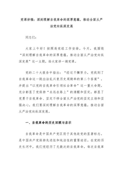 【七哥公文】2024年:党课讲稿:深刻理解自我革命的深厚意蕴,推动全面从严治党向纵深发展+更多免费公文+VX:QiGeGongWen2024