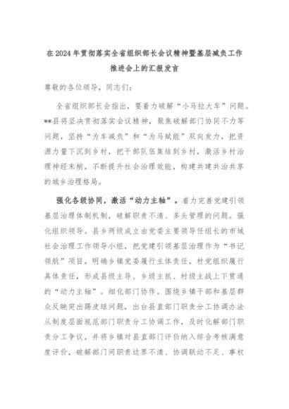 【七哥公文】2024年:在2024年贯彻落实全省组织部长会议精神暨基层减负工作推进会上的汇报发言+更多免费公文+VX:QiGeGongWen2024