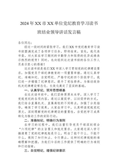 【七哥公文】2024年:2024年XX市XX单位党纪教育学习读书班结业领导讲话发言稿+更多免费公文+VX:QiGeGongWen2024